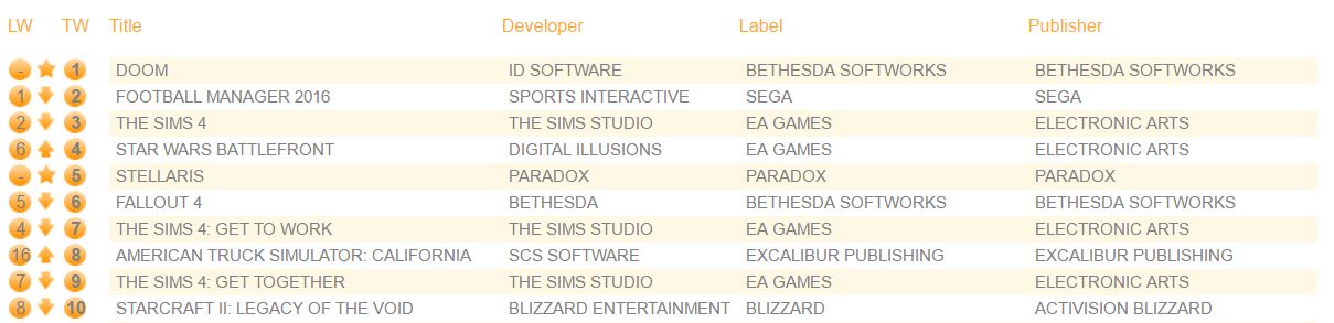 من خلال النتائج التي نشرتها منظمة gfk البريطانية نحصل على الأداء الخاص بالالعاب على الحاسب الشخصي في الأسبوع الماضي وريبوت سلسلة ألعاب التصويب الشهيرة DOOM تصدر القائمة كأكثر لعبة مبيعا في الأسبوع الماضي خاصة مع كونها الإصدار المهم الوحيد على المنصة.