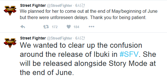 بعد الكثير من الإنتقادات لشركة كابكوم مع إعلانها تأجيل موعد إصدار الشخصية الإضافية Ibuki للعبة ستريت فايتر بجزئها الخامس و الذي كان من المفترض حصولنا عليها بشهر مايو الماضي قبل تأجيلها لوقت لاحق قامت كابكوم بتوضيح المشكلة عبر حساب اللعبة الرسمي بتويتر.