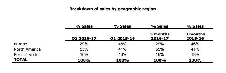 نحصل أيضا على المناطق المختلفة من العالم التي تم بيع عناوين الشركة فيها وكم تشكل مبيعاتها من النسبة الإجمالية ونلاحظ إنخفاض نسبة المبيعات التي يشكلها السوق الأوروبي ولكن يوبيسوفت ذكرت ضمن تقريرها بأن الحكم لا يتم من ربع مالي واحد كما أن الشركة تتوقع من هذه الأرقام أن تتحسن بالنسبة للسوق الأوروبي.