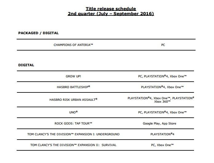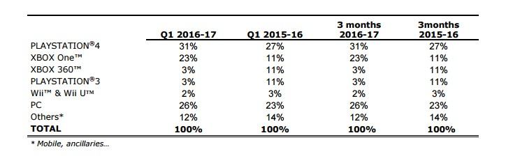 قامت شركة يوبيسوفت الفرنسية اليوم بنشر نتائجها للربع الأول من السنة المالية 2016 – 2017 ونتعرف من خلال التقرير المالي على الأجهزة ذات الحظ الأكبر في مبيعات ألعاب الشركة العملاقة حيث أن البلايستيشن 4 لا زال المسيطر على أغلب مبيعات ألعاب الشركة يليه الحاسب الشخصي ثم الإكس بوكس ون.