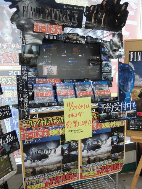 مع الإعلان رسميا عن تأجيل موعد إصدار الجزء الخامس عشر من سلسلة العاب فاينل فانتسي من شهر سبتمبر القادم حتى شهر نوفمبر هاهي المتاجر اليابانية تستعد للحدث بتغيير موعد الإصدار بالملصقات الدعائية للعبة و بدأ قبول الحجوزات للموعد الجديد.