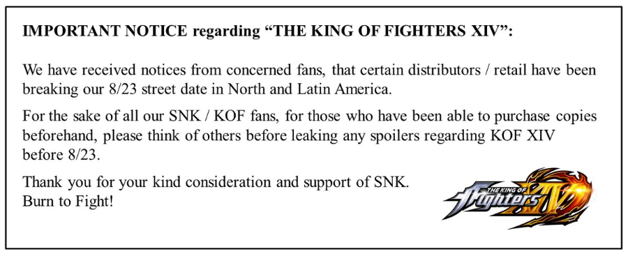 قبل أسابيع من موعد صدورها الرسمي بدأت بعض المتاجر بأمريكا الشمالية و الجنوبية ببيع الجزء الرابع عشر من سلسلة العاب القتال The King Of Fighters مبكرا قبل موعدها على البلايستيشن4 و هذا الأمر لم يعجب شركة SNK مطور وناشر اللعبة كثيرا.