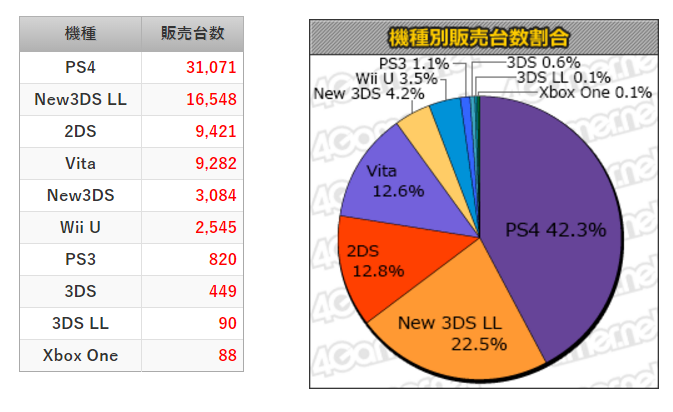 لا جديد هذا الأسبوع على صعيد الأجهزة حيث لا يزال البلايستيشن 4 متصدرا للمبيعات بأكثر من 31 ألف وحدة ويليه الـNew 3DS في المركز الثاني وإجمالا فمعظم الاجهزة تشهد إنخفاضا طفيفا في المبيعات مقارنة بالأسبوع الماضي.